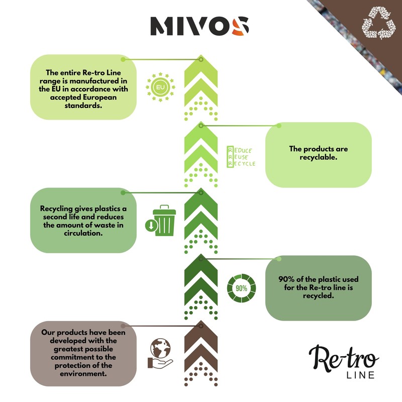 - 90% of the plastic used for the Re-tro Line is recycled.