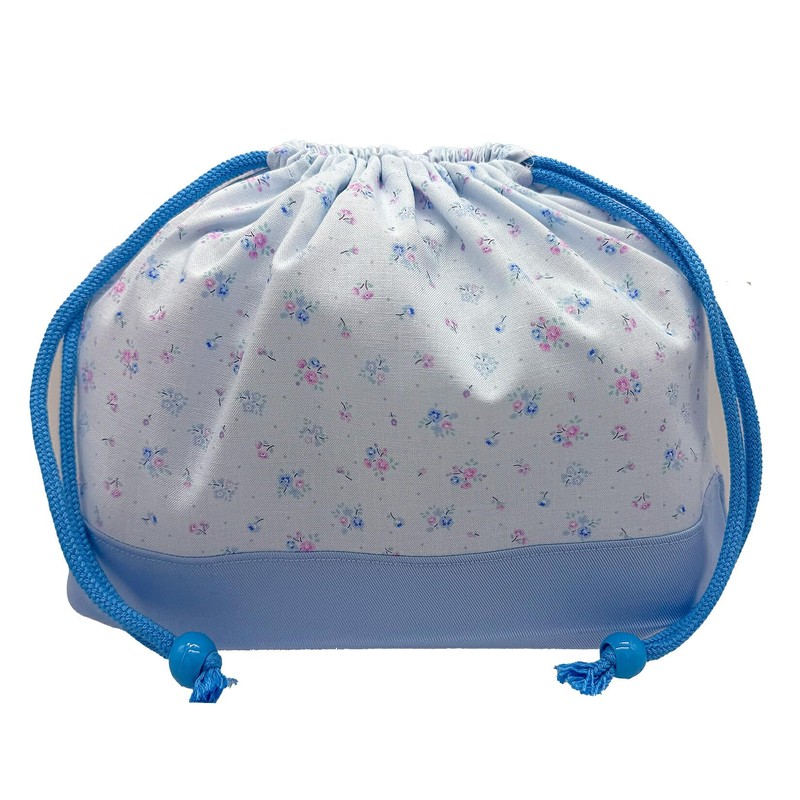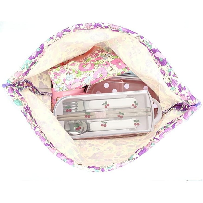 miwaki Lunch Bag, Drawstring Bag, Medium, Girls, Lunch Box, Cup Holder, Gusset, Elementary School, Kindergarten, Nursery, Made in Japan, Handmade with Name Tag, Motif, Blue, Purple, Small Flower,