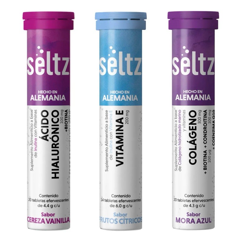 Mix Suplementos Colágeno+ A. Hialurónico+ Vitamina E 3 Tubos Tabletas efervescentes Seltz