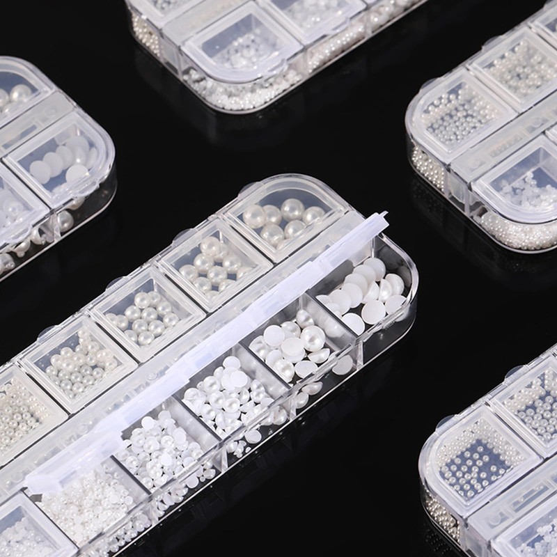 - Pearl Set: 12 grids/box round pearl and half round nail art pearls with 2 colors (rice white round pearl+pure white semi-circular pearl) and 6 different sizes (1.5mm/2.0mm/3.0mm/4.0mm/5.0mm/6.0mm). Each size is packaged in a separate grid for easy storage and carrying