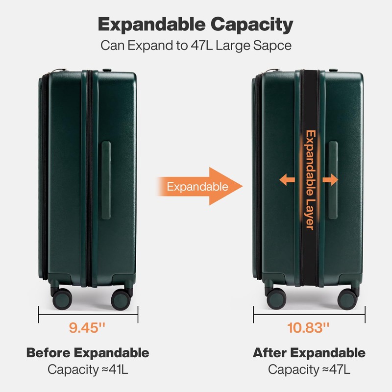 • 【Expandable Carry on Luggage】 Dimensions: 13.98x9.45x21.46 IN (Including wheels), Weight: 8.4 LB. This luggage features an expandable zipper, increasing capacity from 41L to 47L. The spacious main compartment enables convenient and organized packing during your journey