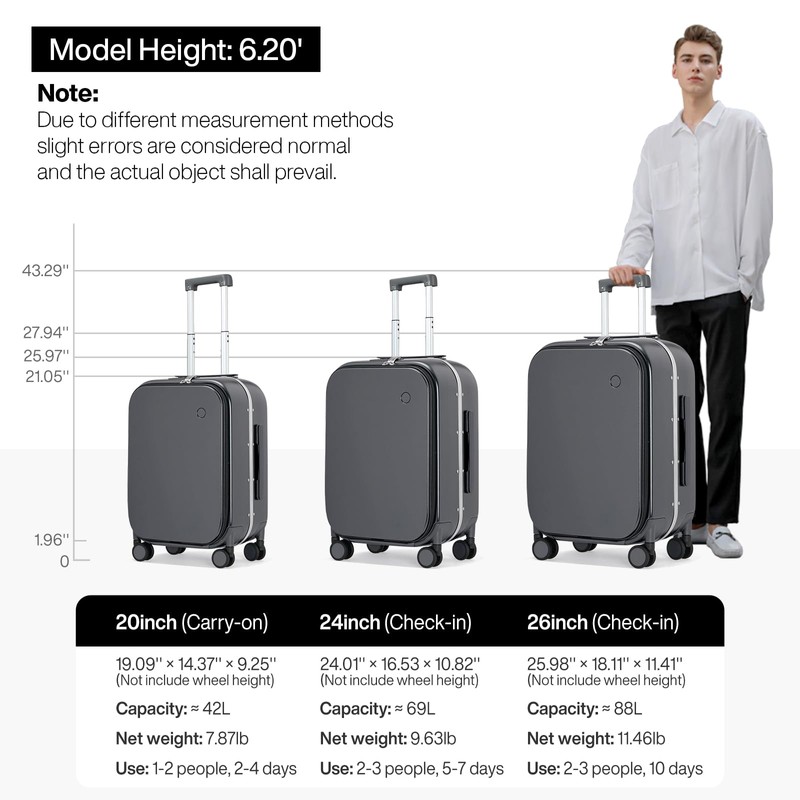 - 【Overall Dimension】Dimensions: 16.53x10.83x26.18 IN(L*W*H, Including wheels), Weight: 9.63 LB, Capacity: 69L. Extremely perfect spinner luggage for work travel, weekend getaways, and international trip