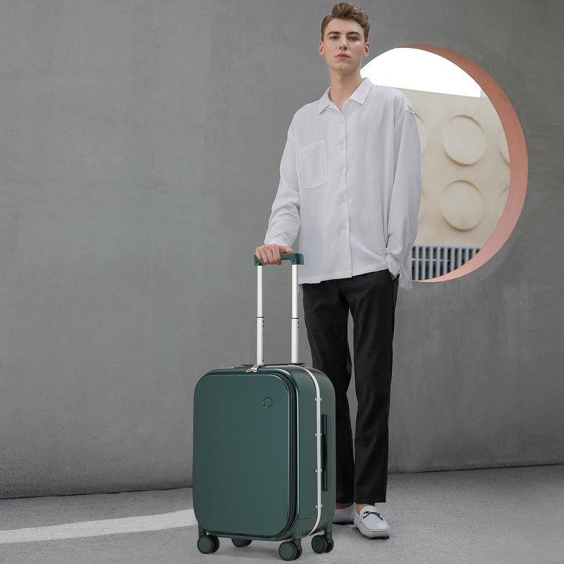 mixi Carry On Luggage, 20'' Suitcase with Front Laptop Pocket, Travel Rolling Luggage Aluminum Frame PC Hardside with Spinner Wheels & TSA Lock and Cover - Blackish Green