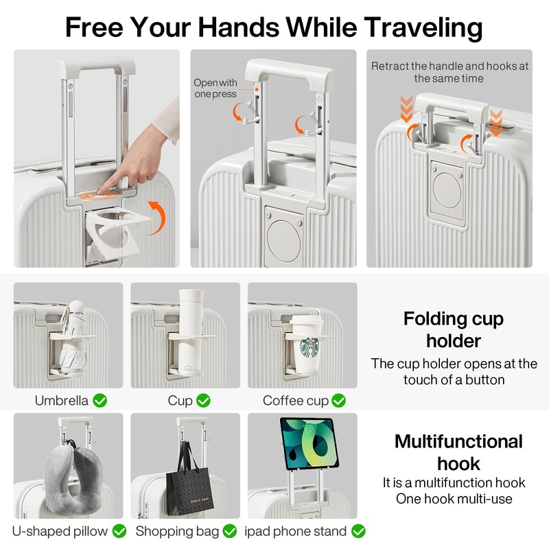 - 【Multifunctional Holder Design】Hidden folding cup holder on the back of the suitcase, phone holder located in top of luggage and the handle hook, all is to provide a comfortable and convenient travel experience.