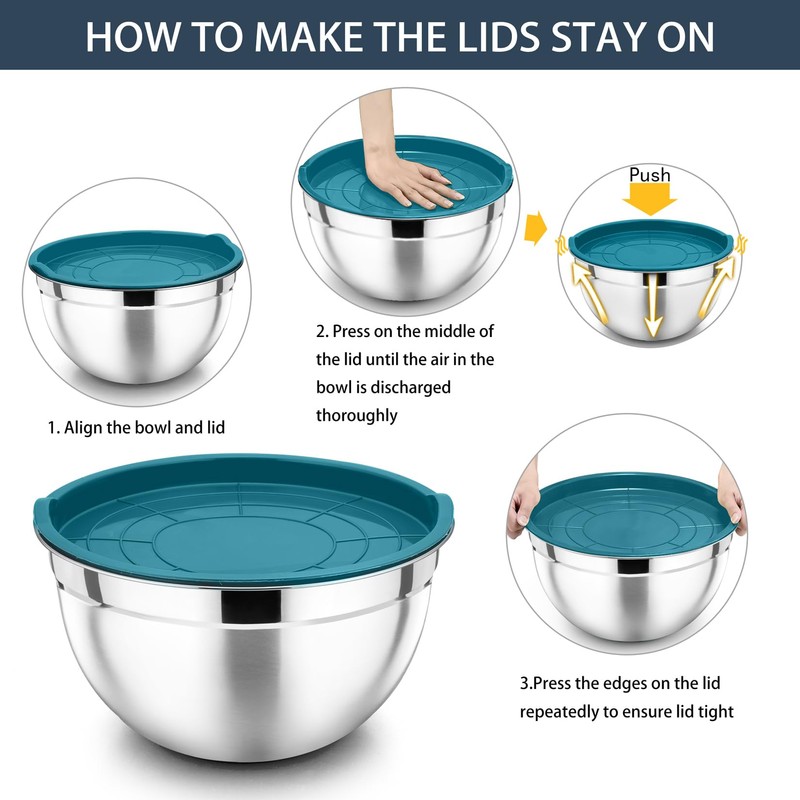 - 【Deep Nesting Bowls】All stainless steel bowls are designed to be deeper than other general mixing bowl set, Easy to avoid food leaking out during working, Both bowls and covers can be nested one by one, To maximize your cabinet space saving
