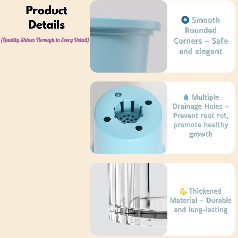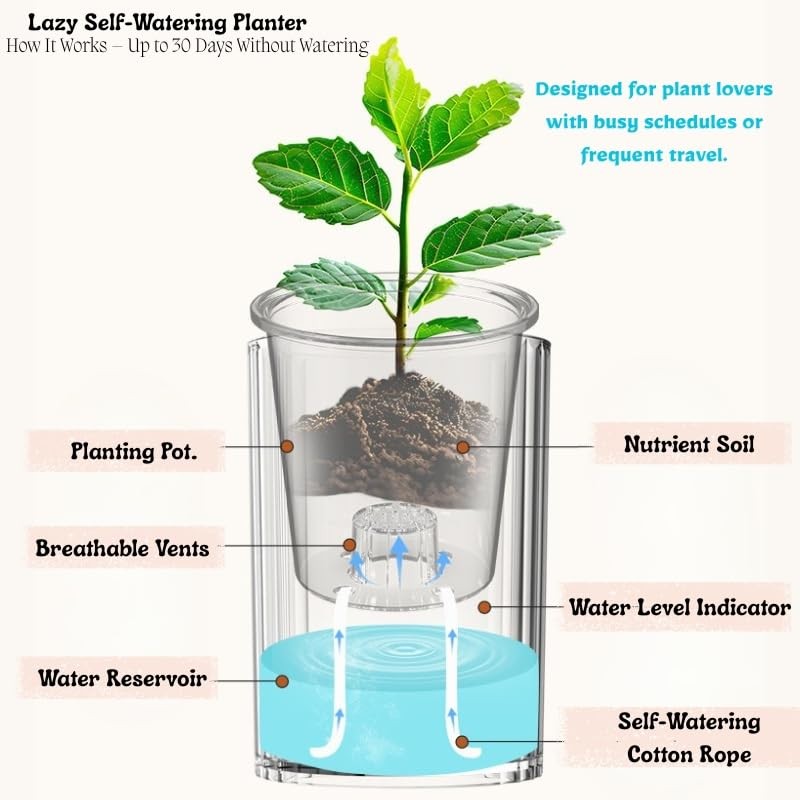 - 🌿 Self-Watering Design – Features a double-layer structure that allows roots to absorb moisture from the water reservoir below—no more over or under-watering.