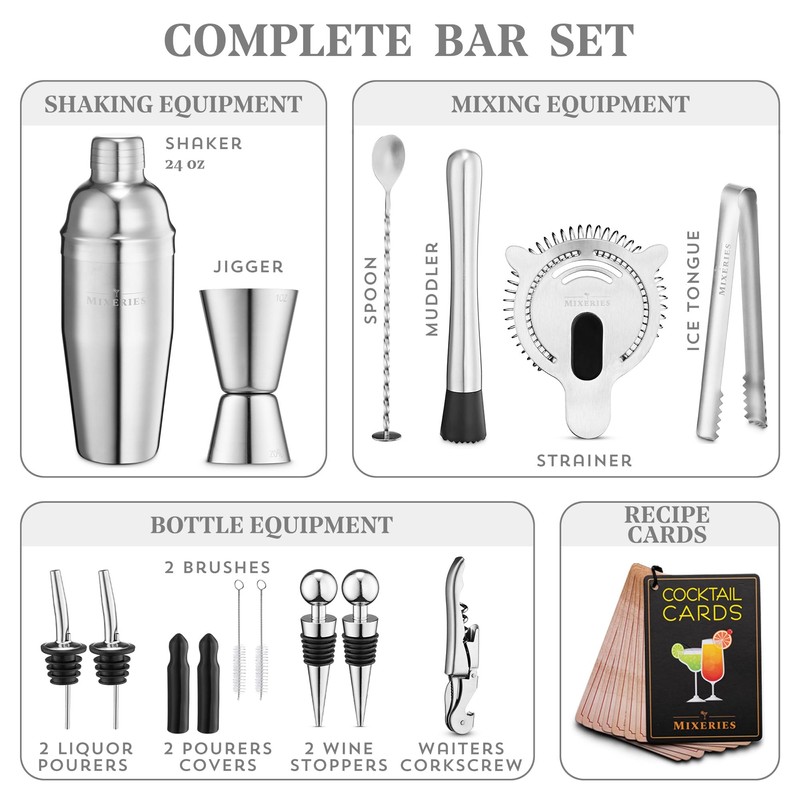 Mixeries cocktail shaker not only looks attractive and elegant but has also been designed to last. The mixology bartender kit is made from high-quality stainless steel that will remain on your bar for many years to come! The Bar set includes the following bar accessories: