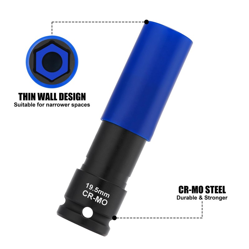 - These wheel nut sockets feature a thin-wall design for easy access in tight spaces, while maintaining full torque performance.The protective outer sleeves prevent wheel damage during tire changes and maintenance, ideal for wheel assembly or disassembly.