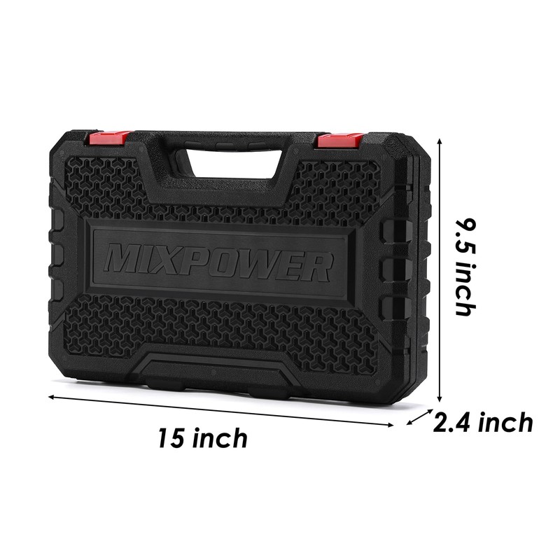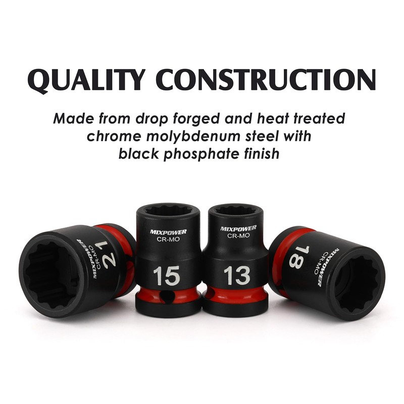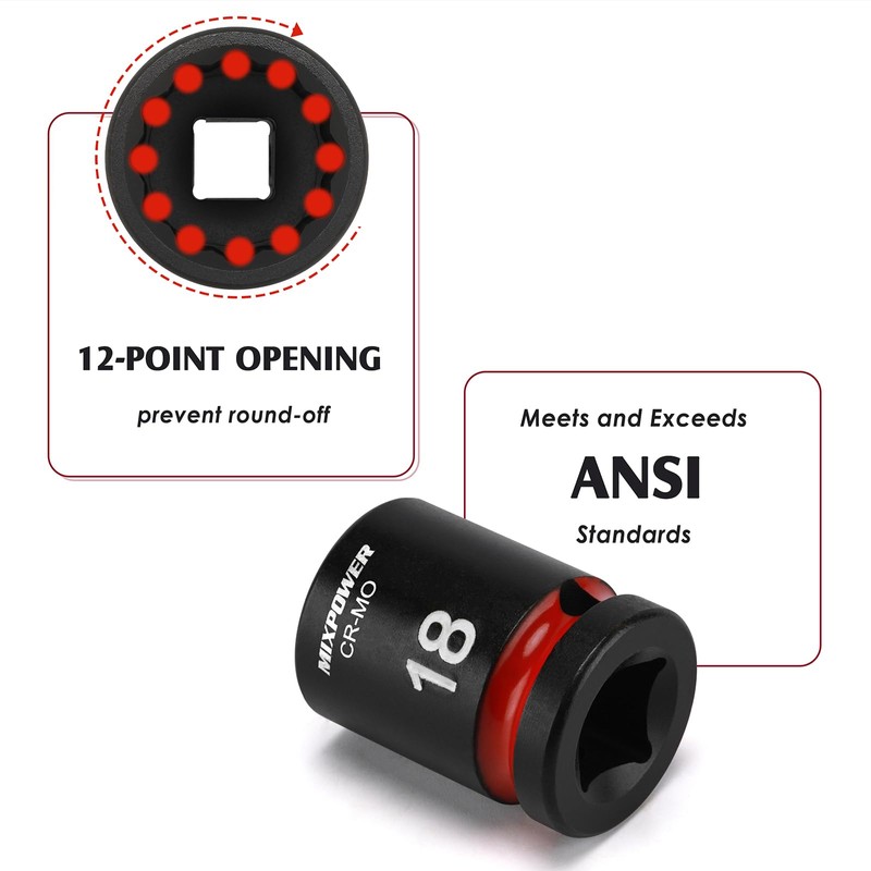 The 26 Pieces 1/2'' Drive Shallow Impact Socket Set are made of chrome molybdenum steel. The design allows bit to reach deep into tight space. There are high contrast and specific size marking for identification. It comes with a sturdy and convenient storage case, which keeps each piece in the proper position. All MIXPOWER Tools meet or exceed ANSI performance standards.