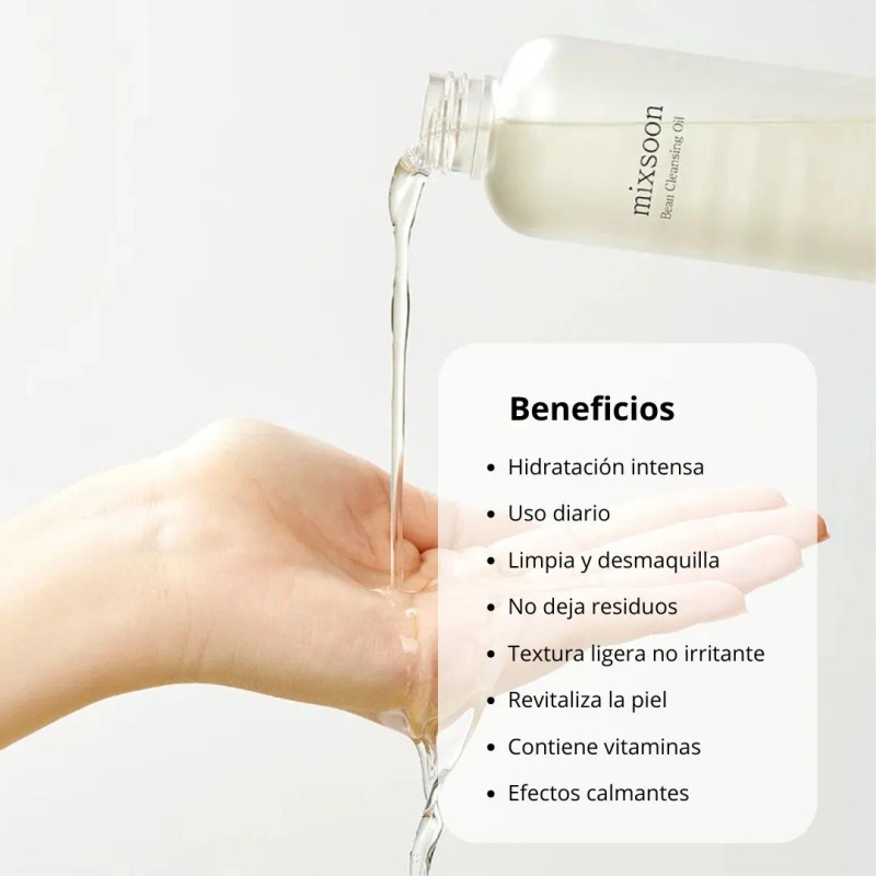 - Mixsoon Aceite Limpiador es un aceite líquido ligero que elimina eficazmente el maquillaje, incluso el resistente al agua, y las impurezas sin irritar ni resecar la piel. Su fórmula hidratante limpia profundamente los poros, previene el acné y exfolia suavemente gracias a sus AHA naturales, dejando la piel fresca, suave y luminosa. Principales ingredientes: Extracto de fermento de soja: hidrata y regenera Extracto de cebada: nutre y revitaliza Extracto de granada: reduce arrugas y mejora firmeza Ácido poliglutámico: hidrata y mantiene la elasticidad Aceites de soja, jojoba y girasol: nutren sin dejar grasa Beneficios: Limpieza profunda y eficaz del maquillaje Exfoliación suave y regeneración celular Hidratación sin sensación grasosa Adecuado para todo tipo de piel Modo de uso: Aplicar 1