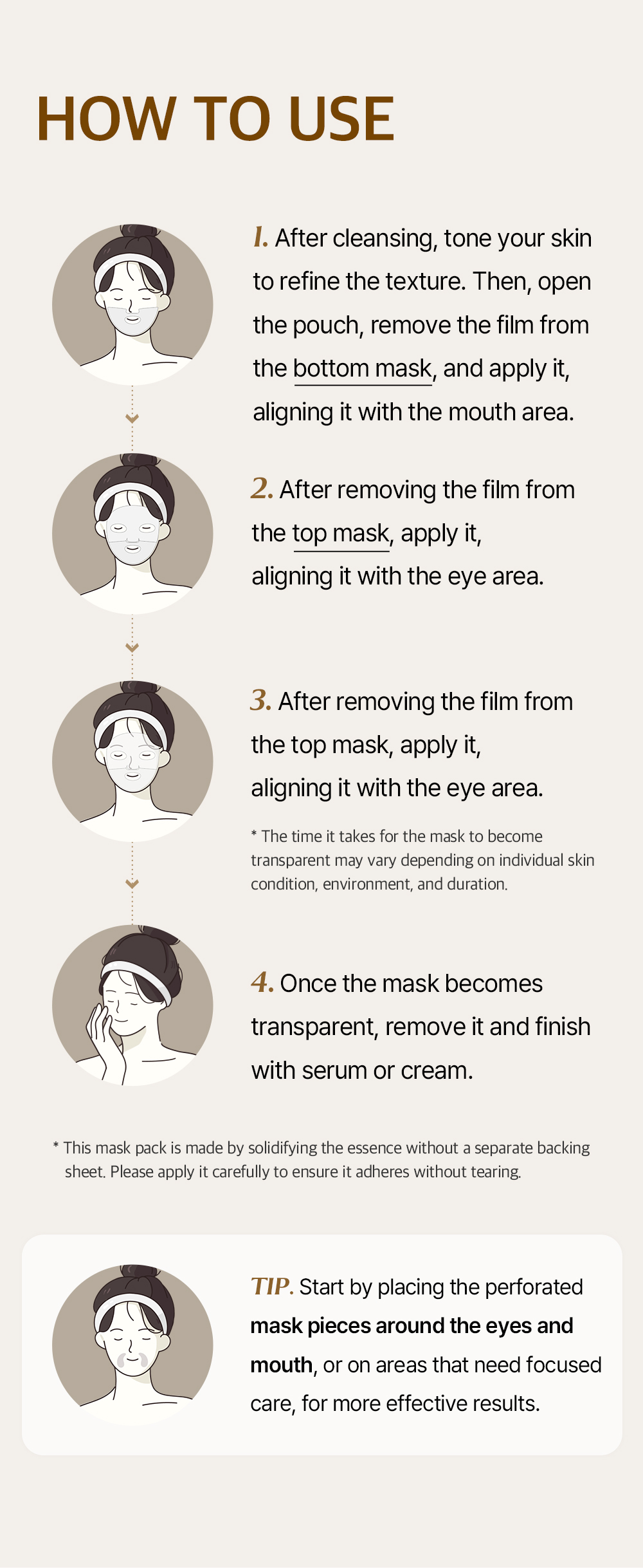 - How to Use: 1. After cleansing, tone the skin with toner. 2. (Lower Half) After opening the pouch, remove the film, and place it around the center of the mouth. 3. (Upper Half) After removing the film, place it around the eye and apply it. 4. Apply for about 20 to 30 minutes, then remove and gently tap the remaining essence on the skin for absorption. TIP * The time the mask becomes transparent may vary from person to person, and transparency may vary depending on skin condition, environment, and time.