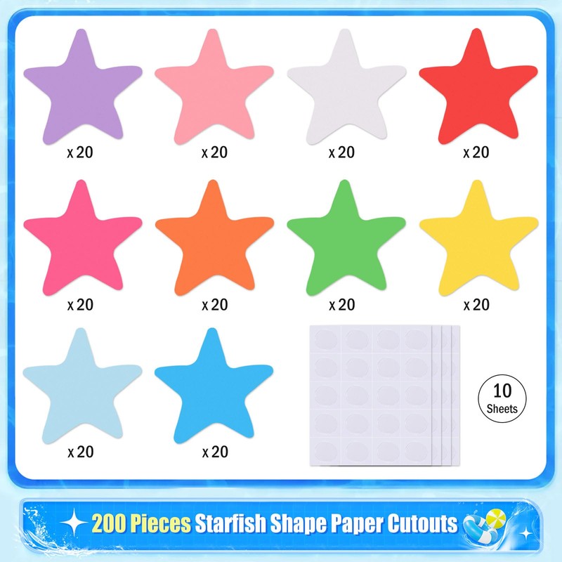 - Under Ocean Decor: You will receive 200 pieces of starfish cutouts in 10 different colors, 20pieces in each color, and come with 10 sheets glue points, sufficient quantity can meet your different needs for decoration or DIY crafts projects, you also can share them with your friends and family.