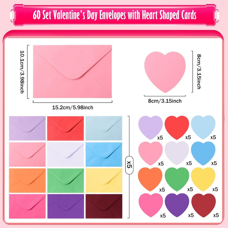 • Package Included: you will receive 60 pieces of heart-shaped cards and 60 pieces of Valentine's Day envelopes, both of them have 12 colors, various colors and sufficient quantity can meet your use needs for Valentine's Day or in daily life.