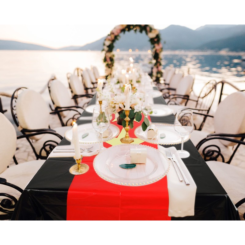 - Time Saving Design: the rectangular black tablecloth plastic is designed with red table runner pattern in the middle, the wise design helps save much time and efforts, and the classic and attractive color scheme can well display your meals