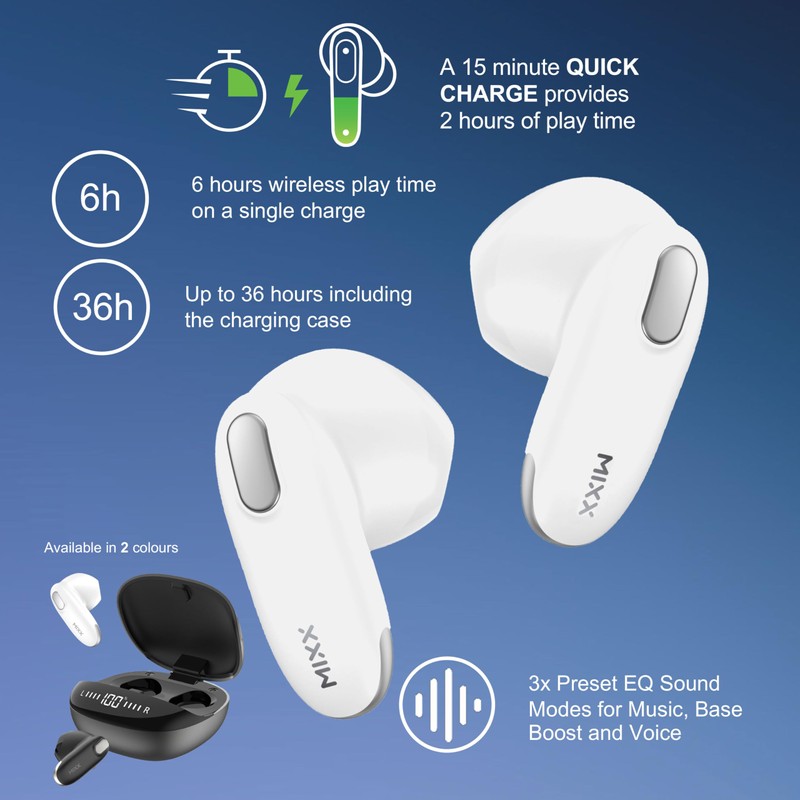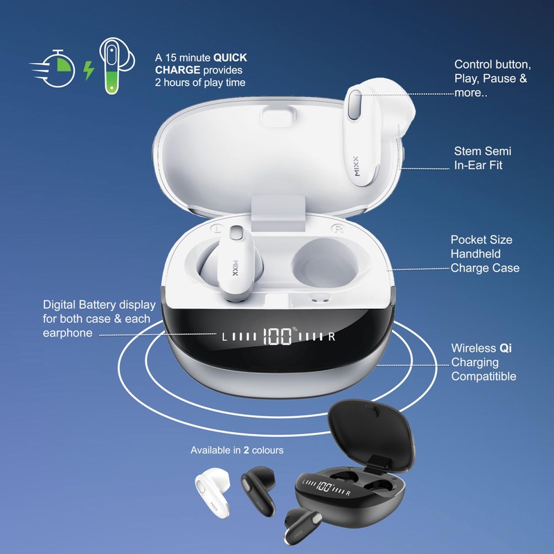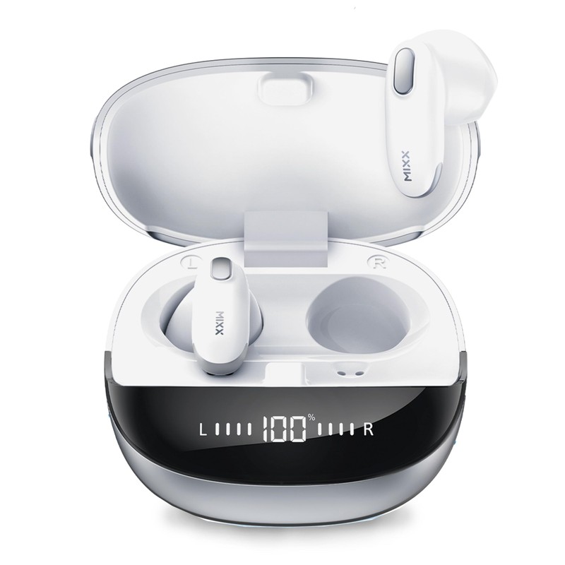 Mixx StreamBuds Charge 2 Hybrid True Wireless Earbuds, Bluetooth Wireless Earphones, 36 Hours Total Playtime, Digital Display, Hands-Free Calling, Qi Charging Compatible