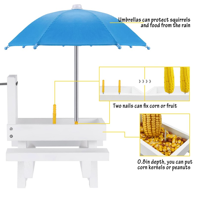 The squirrel bench feeder with umbrella is made of solid wood which is not easy to be corroded. In terms of stability, the structure plays a great role. The bottom structure uses the triangle principle to increase stability. In addition, the squirrel table feeder has a lot of convenient designs for squirrel. In both sides, there are benches for animals. It can accommodate two squirrels at the same time. Besides, in the middle of squirrel feeder chair, there is a screw for fix food. You can put a corn on it. More important, the screw with cover will not stab squirrel when no food is on it. All these designs are convenient for squirrel. More important, the installation require a little time, about 10 minutes. Just discover this corn feeder for squirrels on MIXXIDEA.