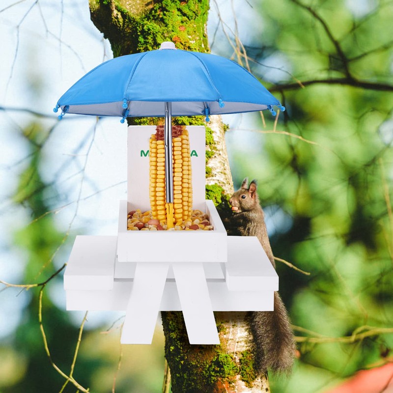 MIXXIDEA Squirrel Feeder Table with Umbrella, Wooden Squirrel Picnic Table Feeder, Durable Squirrel Feeder Corn Cob Holder, with Solid Structure and 2 x Thick Benches(White&Blue)