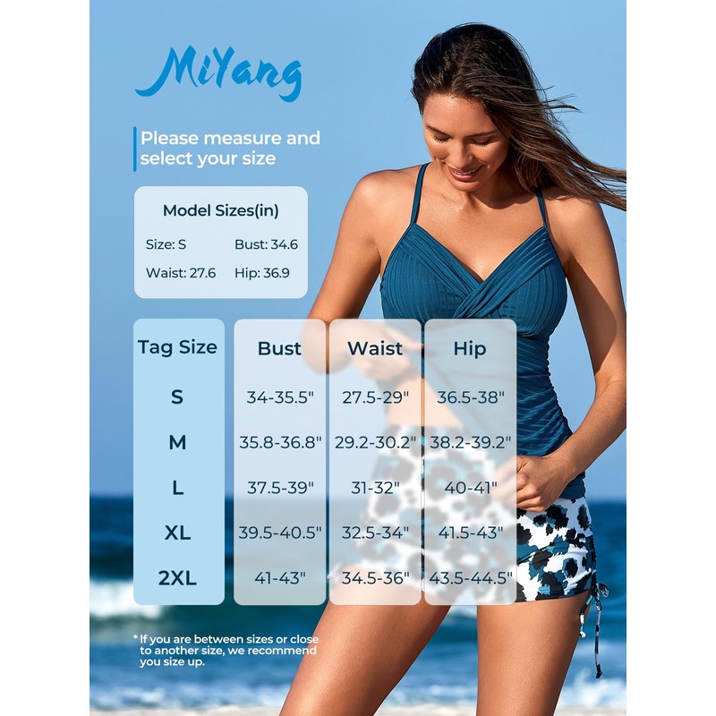- Tankini with boyshorts: This women's two piece swimsuits includes high-waisted bottoms for secure coverage and worry-free movement. Adjustable drawstrings on the sides and crisscross shoulder straps at the back add stylish accents and customizable comfort.