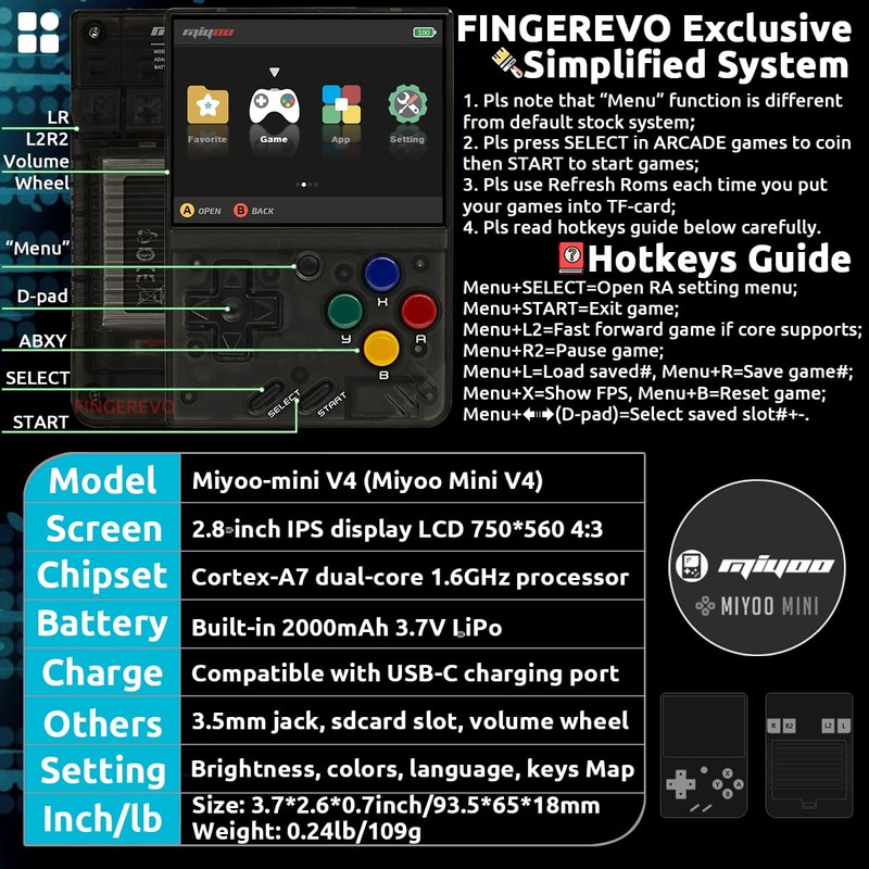 - Package contents: 1*Miyoo-mini V4 Transparent Black-64, 1*Portable Case, 2*Screen Protector, 1*USB-C Cable, 1*TF-card Reader, 1*Instruction.