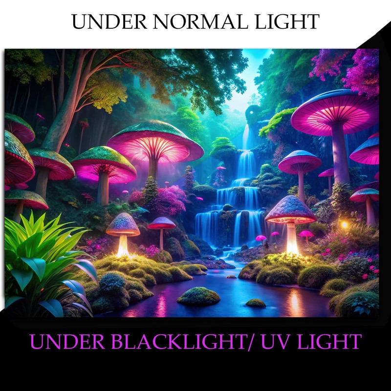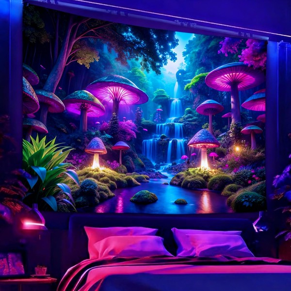 - Glow in the Dark Magic: Transform your space with this Blacklight UV Reactive Tapestry, featuring glowing neon mushrooms, a luminous waterfall, and a dreamlike fantasy forest. Watch it come alive under blacklight for parties, bedrooms, or creative studios.