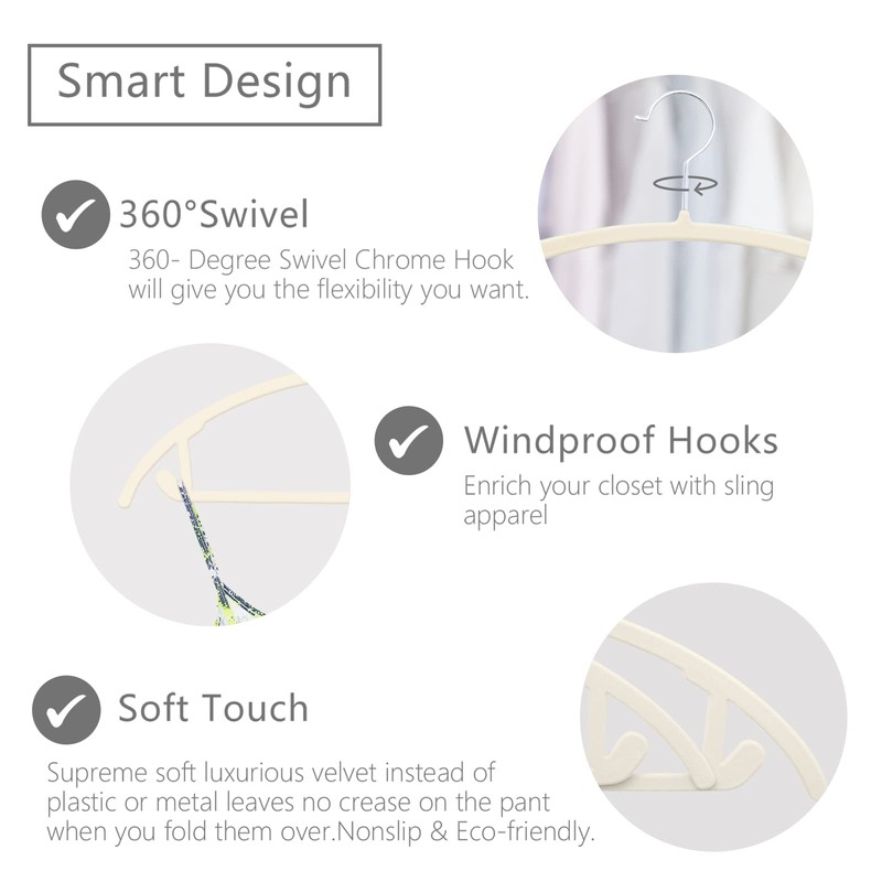 - ✔【Full Adult Standard Size】- (LxWxH): 17.8"x0.2"x8.26" inches.Made of Top Quality ABS Plastic, Eco-friendly Ivory Nylon Flocked, Chrome Hook.VALUE PACK of 50 pcs . ✔【Swivel Chrome Hooks】- Can be 360 degree rotated, which easy sorting of clothes no matter which direction you hang your clothes, strongly attached to our durable hanger so the hook doesn't detach or snap easily