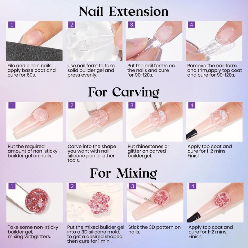 - Firm builder gel: This improved building gel can be used as a nail extension gel and has a soft, non-flowing and non-sticky texture. When using, you can apply it flexibly with your fingers or a silicone nail pen. Make nail beauty easily yourself
