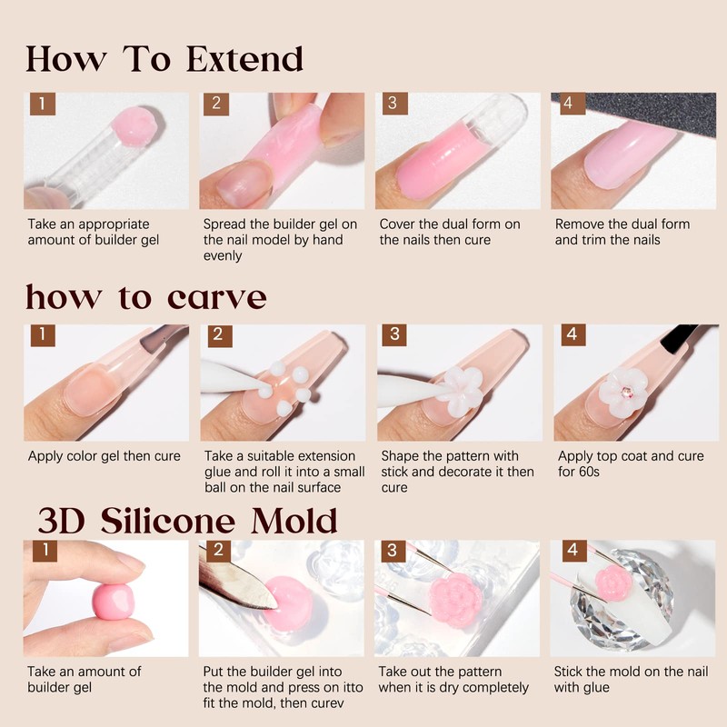 - HOW TO USE: Take the carving extension gel, shape it into a ball and place it on the nail surface. Then shape the pattern with glue stick( not including), decorate it and finish. Require base top coat, and need to cure under UV/LED lamp. PS: Keep the builder nail gel in a cool place.