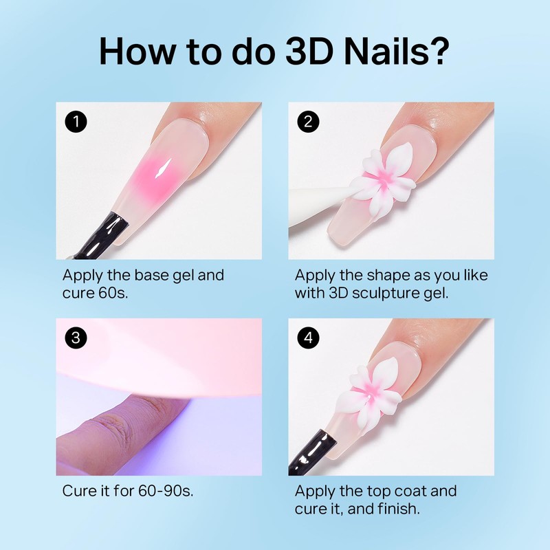 - MIZHSE 3D Sculpting Gel: You can use the white 15ml solid gel and 1* dual-use nail art pen to create a variety of 3D shapes, and you can also design nail styles with other color gels, knead it into the shape you want, or use it with dual-use nail art pen