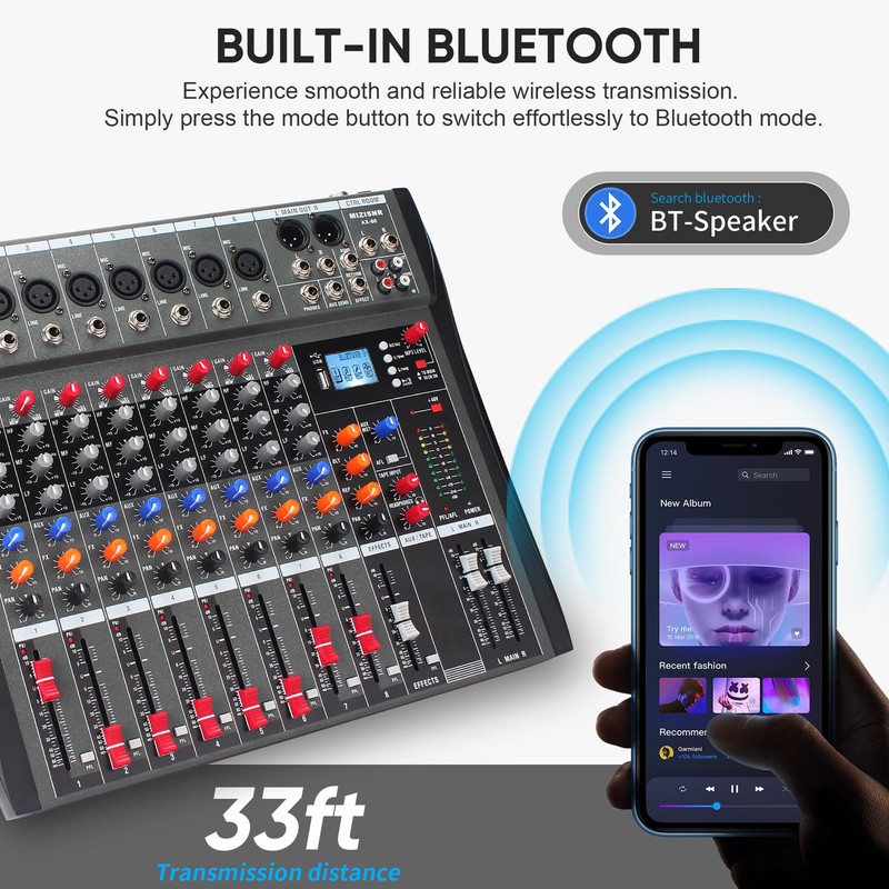 - Bluetooth Wireless Streaming: The music mixer includes Bluetooth for wireless streaming, enabling it to be used as an input to mix signals with other input channels. It is compatible with iPhone, Android, iPad, tablet, and MP3 players. Note: The wireless range is 33 ft.