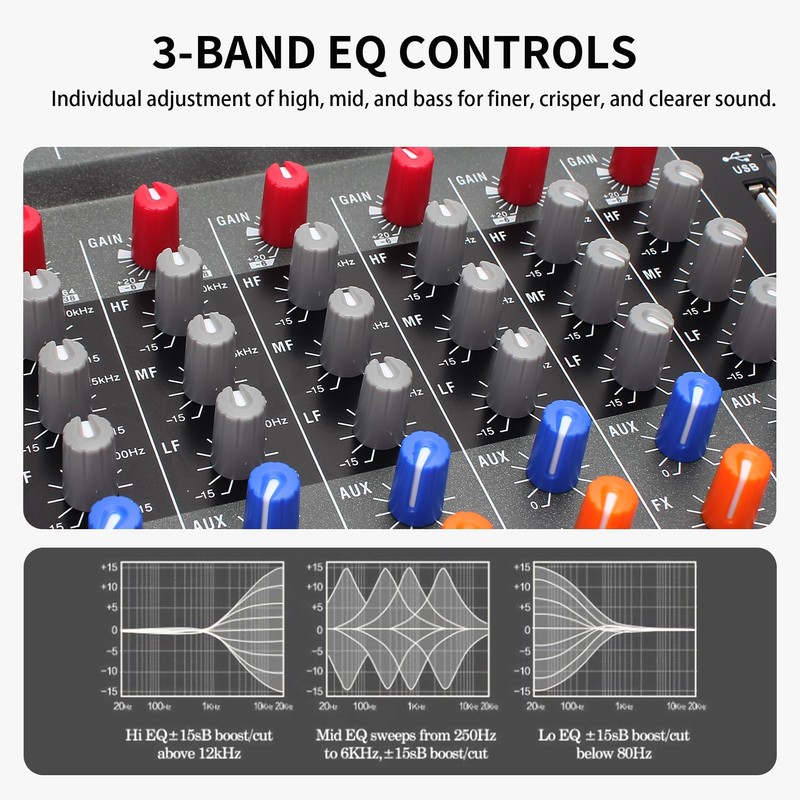 - High Sound Quality: This dj mixer equipped with 3-band equalization, allowing independent adjustment of high, mid, and low sound effects via the knobs. Provides exquisite processing of vocals and music at any time. Additionally, you can modulate a variety of sound effects and achieve stereo sound, ensuring the right effect for different occasions.