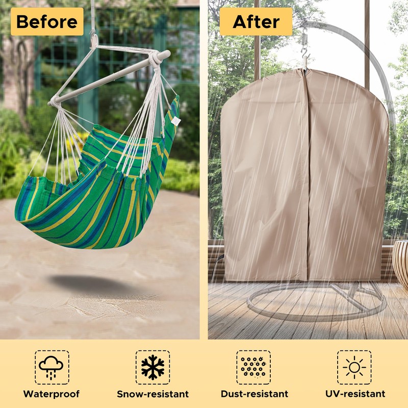 - Protective Waterproof Rain Cover: The included rain cover ensures your hammock chair stays protected from rain, UV rays, dust, and dirt. Made from durable waterproof Oxford fabric, the cover features a windproof zipper, rain flap, and magic tape bottom to securely fit the chair and keep it dry.