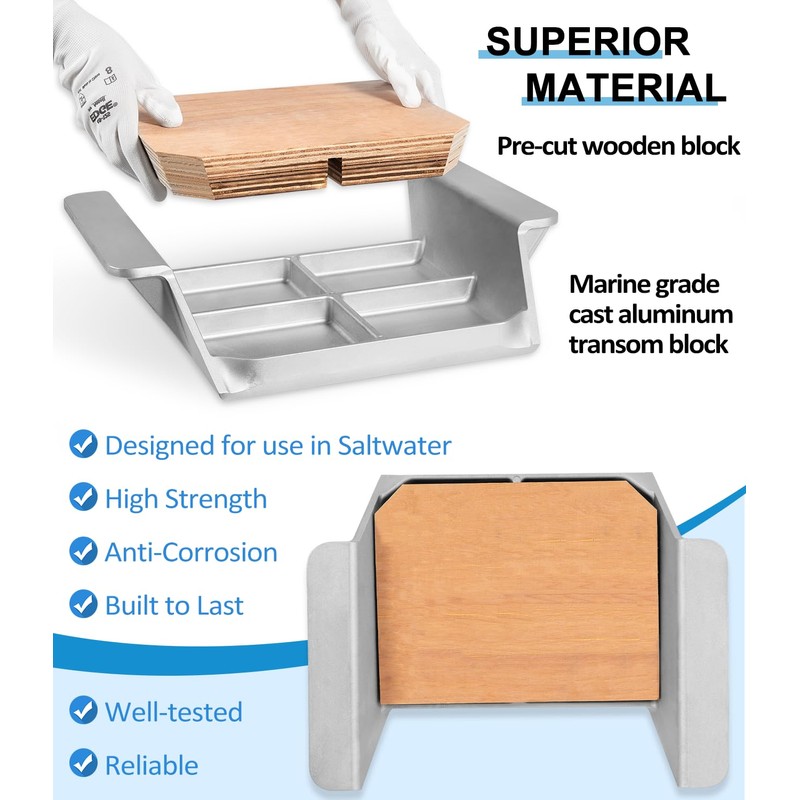 - 【High Quality Material】: This Heavy-Duty Transom Block is made of marine grade cast aluminum. Well-tested, reliable, high strength and anti-corrosion for much longer service time, designed for use in saltwater.