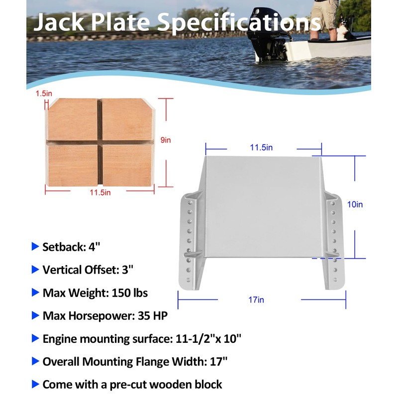 - 【Jack Plates Specifications】: Setback: 4", Vertical Offset: 3". Engine mounting surface: 11-1/2" wide x 10" high. Overall transom mounting flanges width: 17". Come with a pre-cut wooden block.