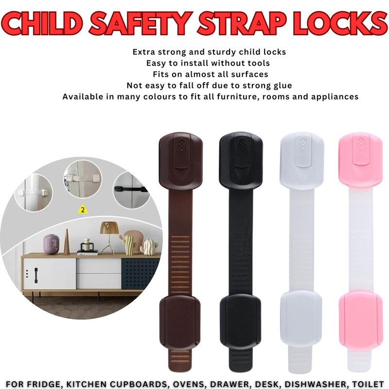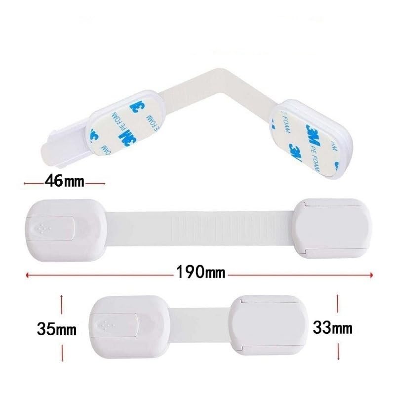 - These cabinet locks feature high-grade 3M adhesive for a secure hold. Their flexible strap design allows them to easily wrap around various items, from toilet seats to refrigerators.