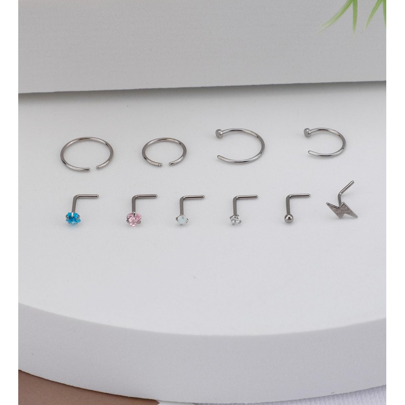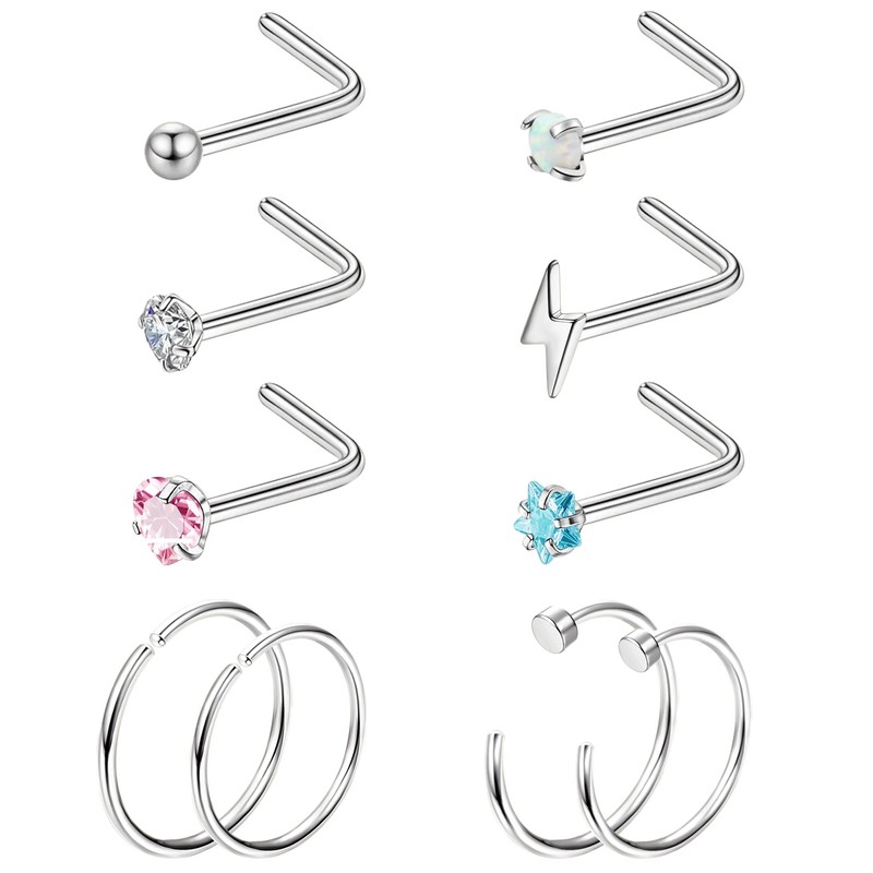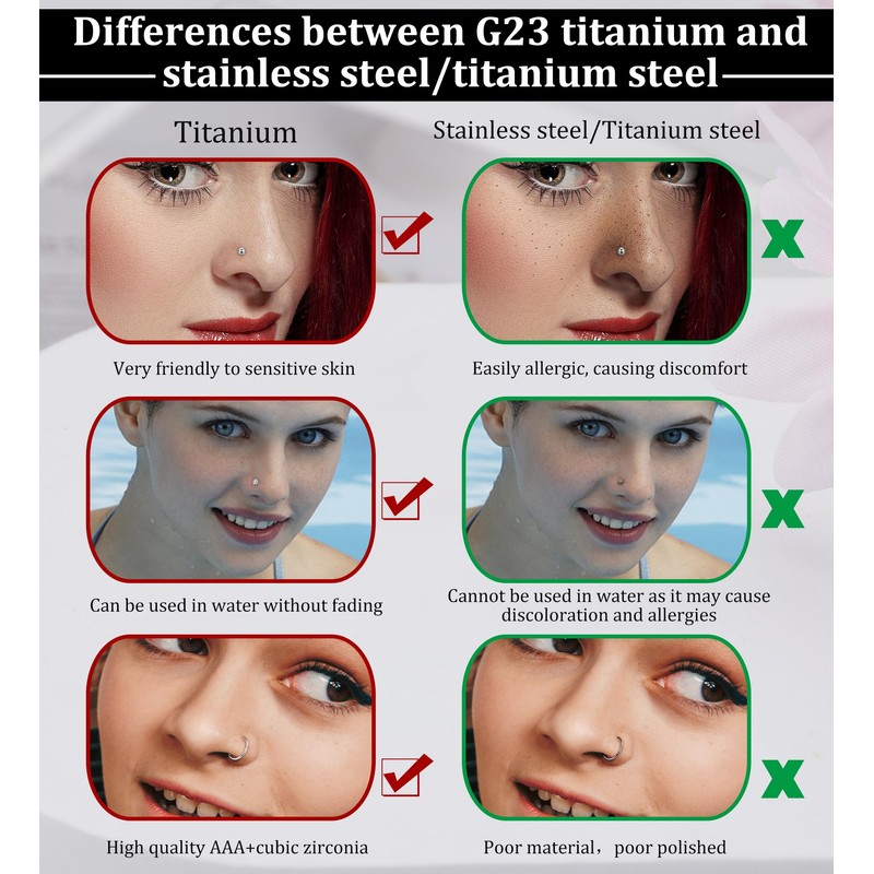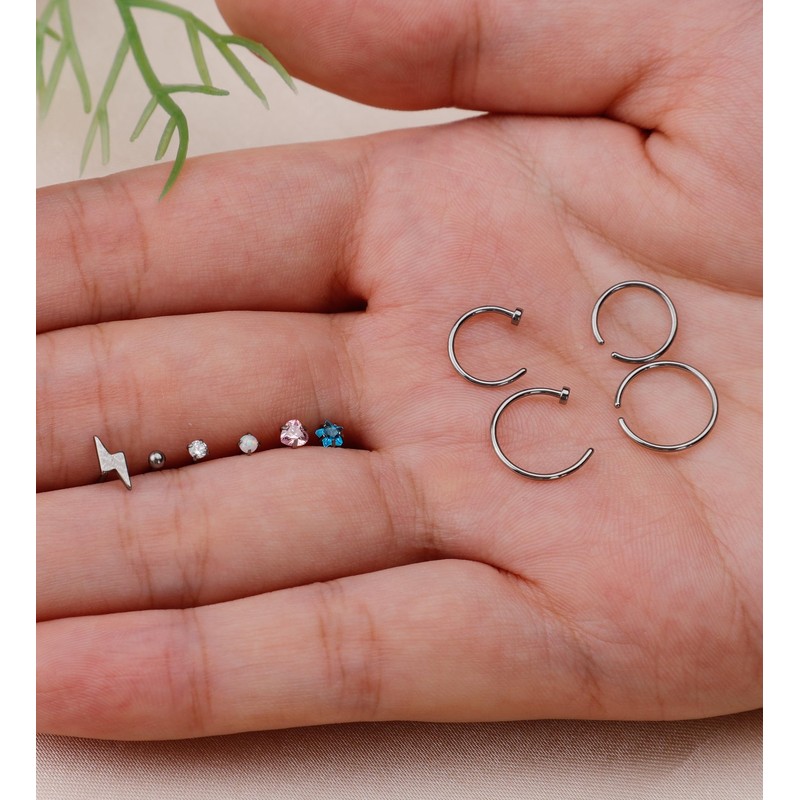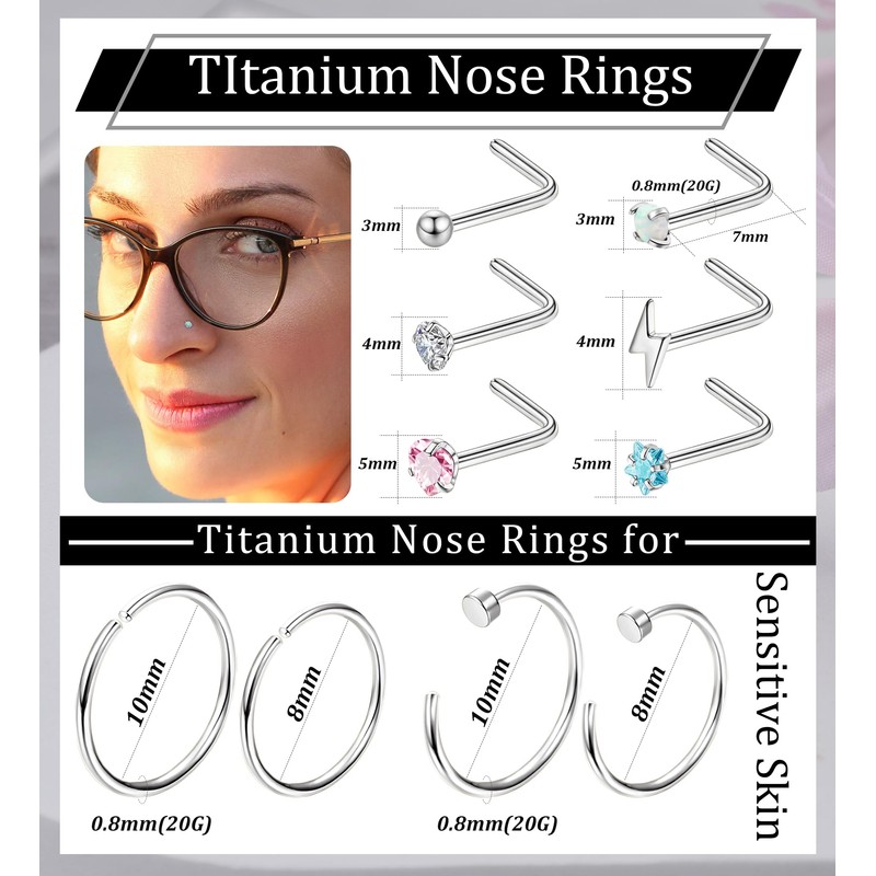 - ใ๐๐ข๐ญ๐๐ง๐ข๐ฎ๐ฆ ๐ ๐๐ก๐๐ฉ๐๐ ๐๐จ๐ฌ๐ ๐๐ญ๐ฎ๐ใ--You will get 6PCS of titanium nose studs and 2 pairs of titanium nose hoops. Including cz /star/lightning/hear/cz l nose studs. Wear these titanium nose rings and hoops alone or with your other jewelry will either be great.
