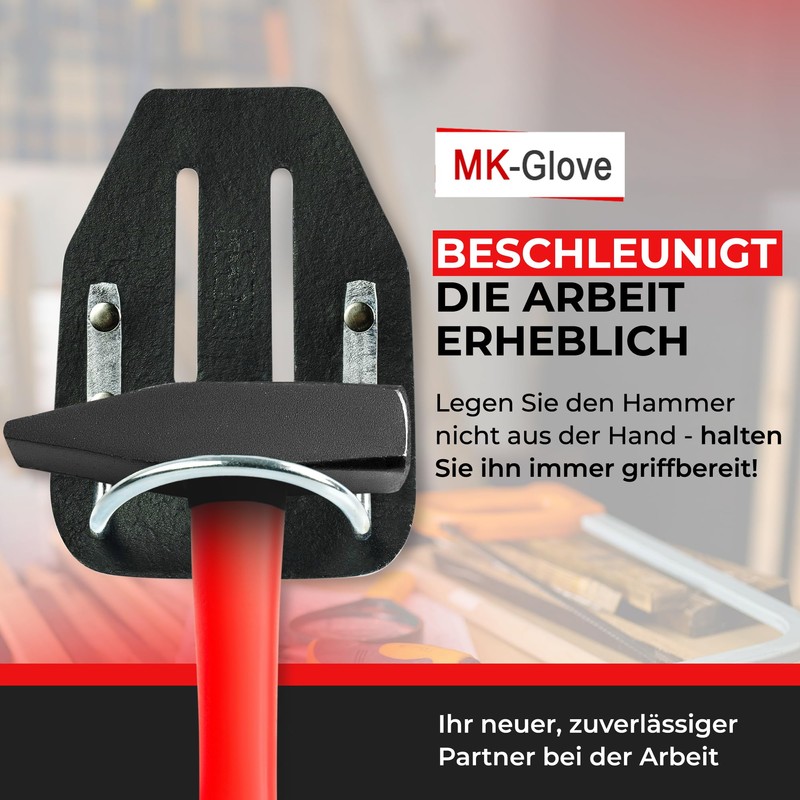 Ergonomic design - This practical hammer holder from MK-Glove allows quick and easy access to tools while working. The holder allows you to pull out the hammer freely and effortlessly and easily attach it back into the holder. It ensures that you don't have to waste time putting down the hammer, so you can work faster and freely.