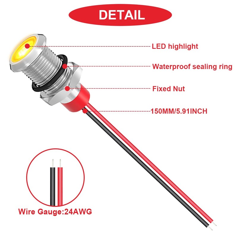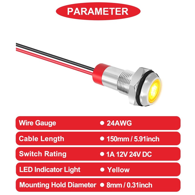- Specifications,Mounting Hole Diameter:8mm;Cable Length:150mm /5.91inch;Wire Gauge:24AWG;Voltage:12-24V;LED Color:Yellow.