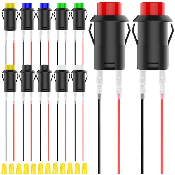 MKBKLLJY 12 x 12 mm Momentary Red/Yellow/Blue/Green/Black/White Mini Push Button Switch AC 250 V/1.5 A 125 V/3 A SPST 2-Pin Snap-in Design with Terminal Wires and Wiring Cap for Car Boat