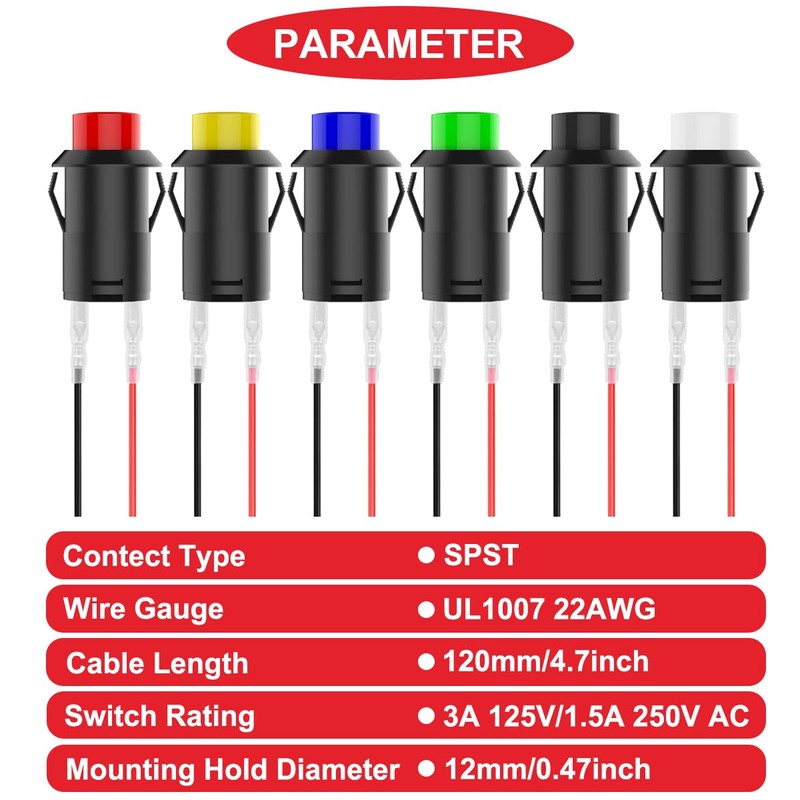 • Specifications: operating mode: current; terminals: 2 pin; polarity: SPST; voltage and current: AC 250 V/1.5 A; AC 125 V/3 A; cable length: 120 mm/4.7 inches; wire thickness: 22 AWG; push button hole diameter: 12 mm; push button hole thread: 0.75 mm; material: plastic/metal; colour: red. YYYYYYYGreen/Black/White