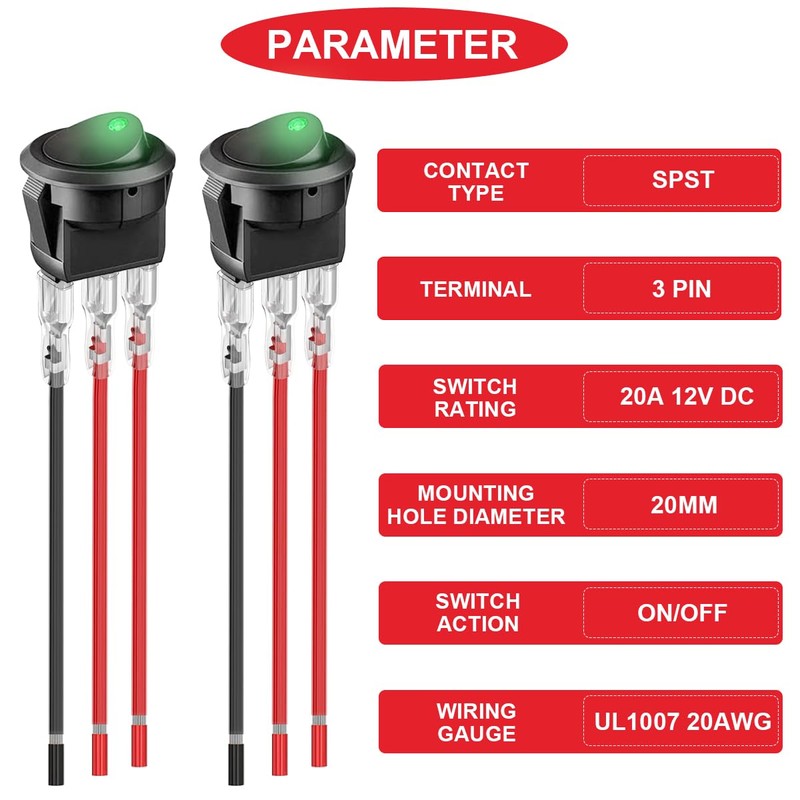 - Parameters: rated voltage and current: 20 A 12 V DC; positions: 2 (on/off); pin quantity: 3; mounting type: panel mount; contact type: SPST; mounting hole diameter: 20 mm/0.79 inches; cable length: 120 mm/4.7 inches; wire thickness: 20 AWG; material: plastic, metal; LED colour: GreGreGre