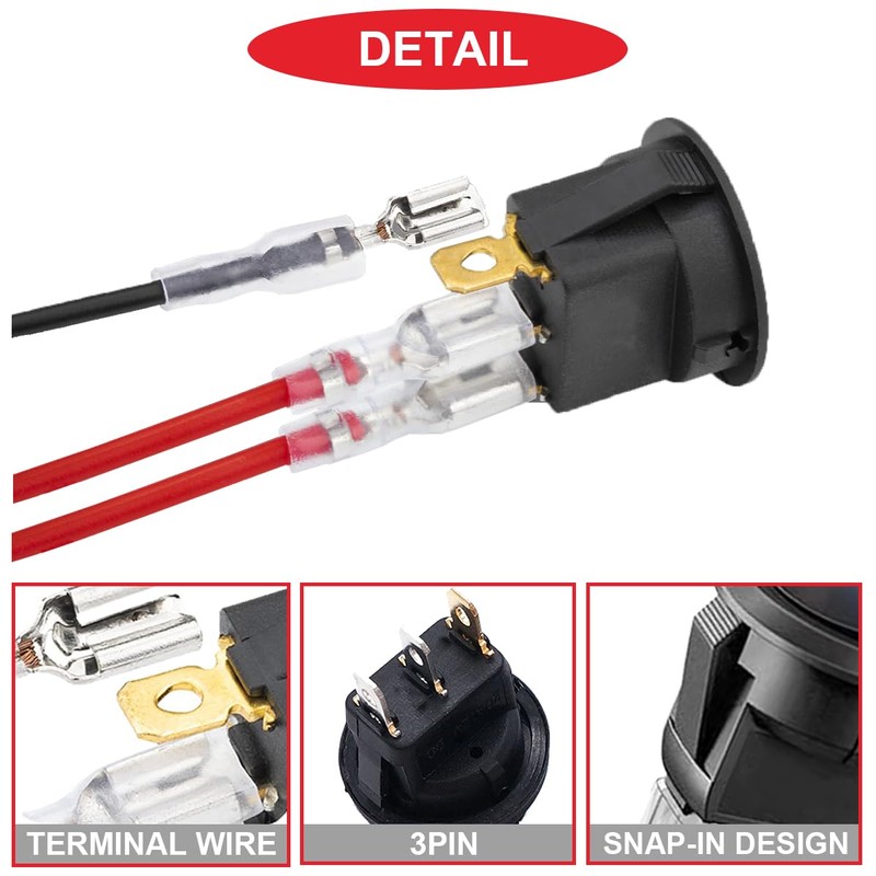 - Perfect design: designed to connect and disconnect a DC12V 20A circuit as desired, SPST: ON-OFF control; 2-pin design (on/off), 3. Pole with LED to connect to the earth. Fluorescent bulbs light up when the switch is on.