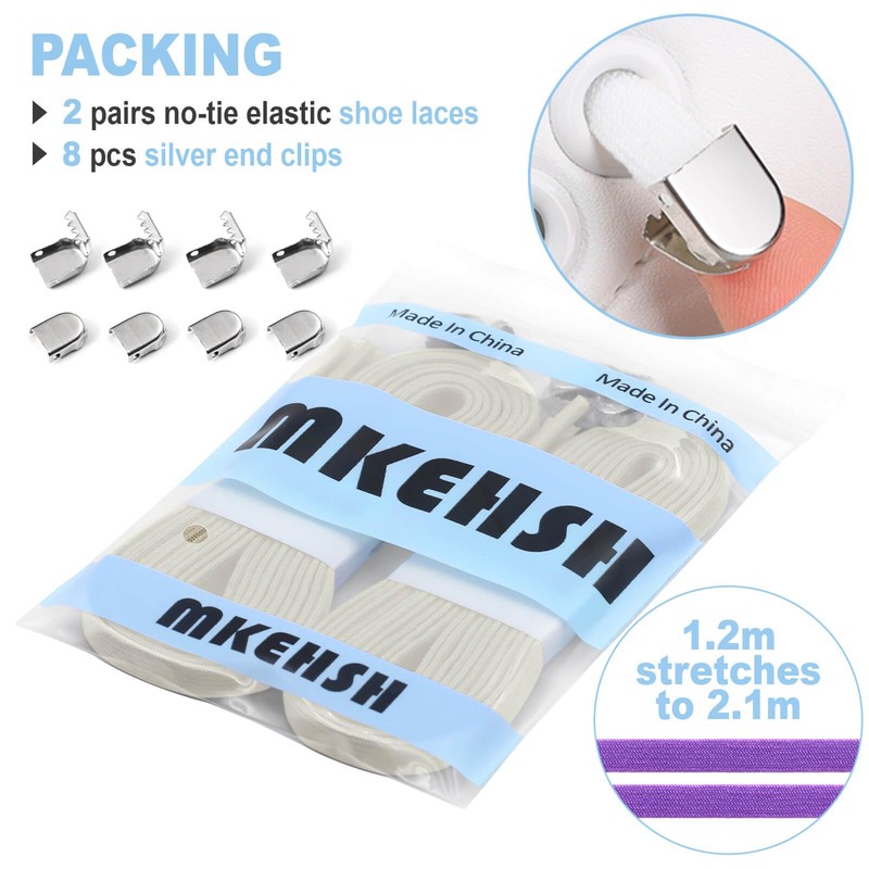 - PACKING: Including 2 pairs elastic no tie shoe laces + 8 pcs silver end clips. MKEHSH shoelaces are 0.31 inch(8mm) in width, 39 inch can stretch up to 68.11 inch in length, and 47 inch can stretch up 90.55 inch in length. Due to the high elasticity of shoelaces, there may be an error of 3-5cm in actual measurement. The size fits all for kids and adults, and also can be trimmed to the desired length.