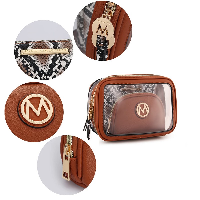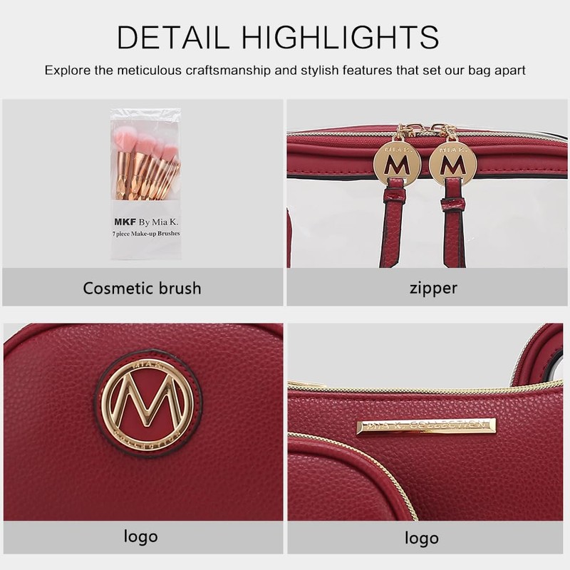 • Laura Cosmetic case is a 10-piece set. The most amazing style to have. It has a large Pouch to fit everything for your cosmetic comes with our signature Mia K. zipper Puller, a medium extra Pouch that fit in foundation and much more with our medal square emblem, and a small extra pouch for anything you desire with our circle emblem. This set comes with 3 makeup pouches and 7 makeup brushes.