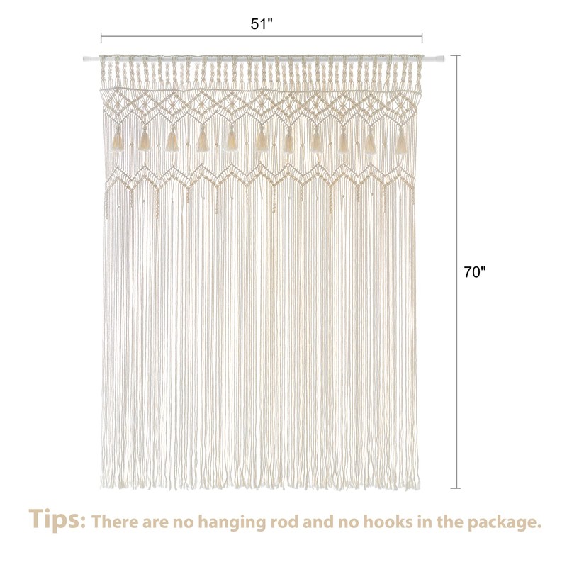 - Material and Size: The hanging decor is made of cotton ropes. Size measures approximately: 51 "Wide x 70" Long. And there may be a 1-to-2-inch deviation in size for it to be a hand-made item. Please note the size of this item before purchasing it. Tips: This is not a blackout curtain. There are gaps between the macrame ropes, so it's a bit see-through.