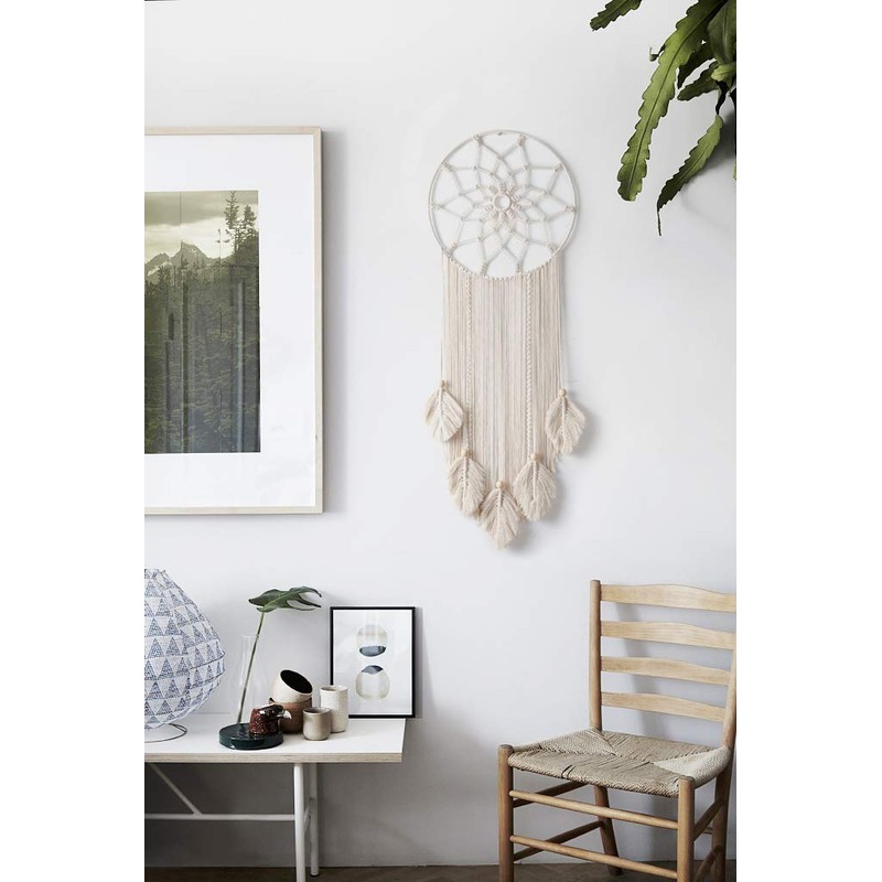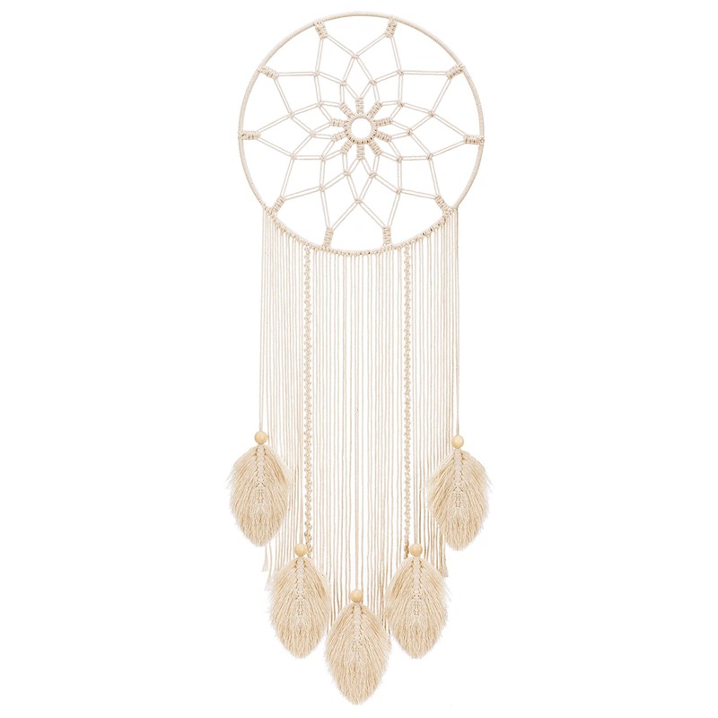 - Materials: Cotton, metal ring and wooden beads. Unique designed and handcrafted, this unique piece will be sure to be the center of attention wherever you choose to hang it.