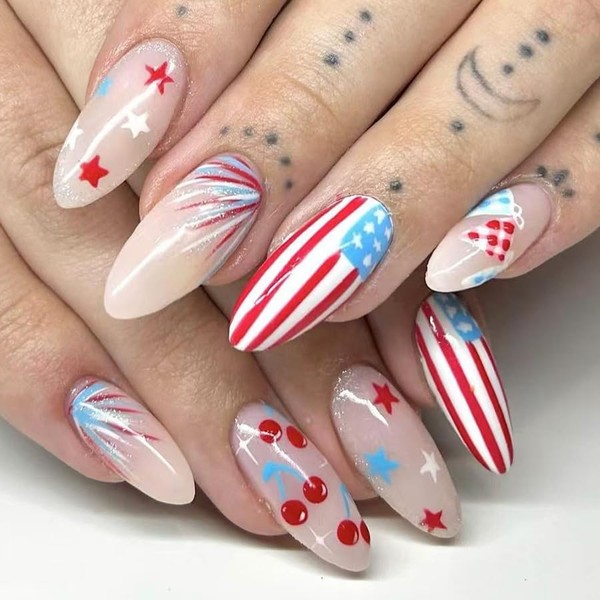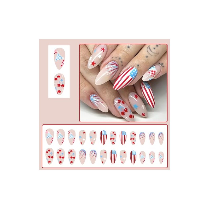 Mkwntg 24Pcs Independence Day Press on Nails Medium Almond Fake Nails with American Flag Design 4th of July Acrylic False Nails Firework Glitter Glue on Nails Summer Cherry Stick on Nails for Women
