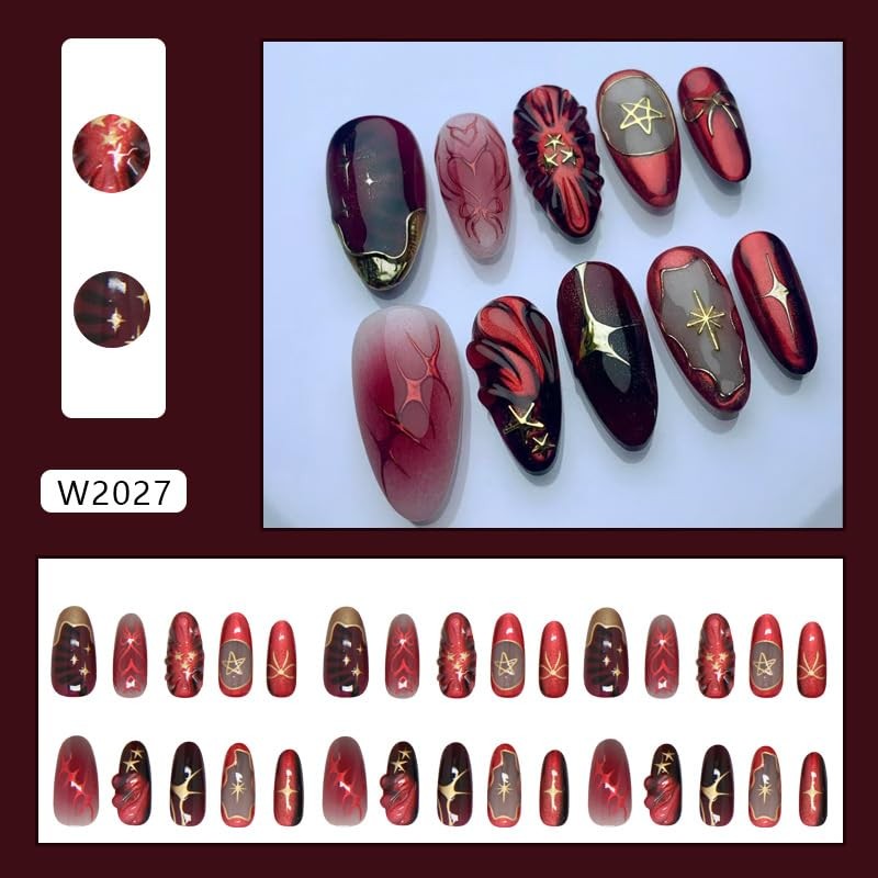 Mkwntg 24Pcs Red Black French Tip Press on Nails Medium Almond Fake Nails with 3D Butterfly Golden Star Design Silver Bow Stick on Nails Y2K Full Cover Gold Line Glue on Nails for Women Manicure