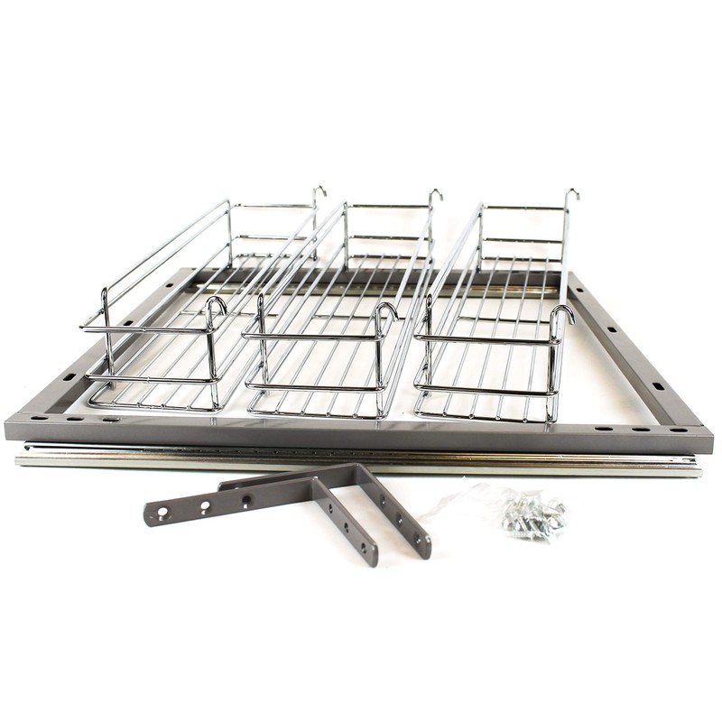 - 3 wire baskets included. Cabinet organizer for narrow-width cabinets.