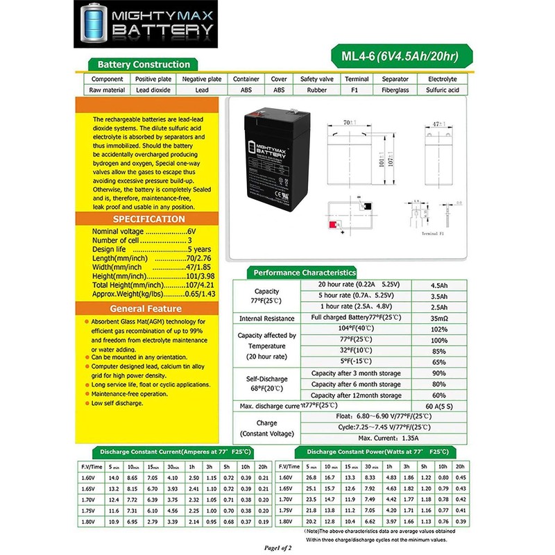 Delivering power when you need it, the Mighty Max ML4-6 6 Volt 4.5 AH uses a state of the art, heavy-duty, calcium-alloy grid that provides exceptional performance and service life in both float and cyclic applications. The ML4-6 is an Absorbent Glass Mat (AGM) technology with a valve regulated design, that can be used in enclosed and indoor environments without leaking or maintenance, providing a superior performance for thousands of models. Mighty Max SLA batteries are utilized in a wide variety of applications including; Consumer Electronics, Electric Vehicles, Engine Starters, Golf Carts, Hunting, Lawn and Garden Tools, Medical Mobility, Motorcycles, Power sports, Portable Tools, Solar, Toys and Hobby, Access Control Devices, Emergency Lighting, Security and more. **Specifications:** Voltage: 6 Volt Amperage: 4.5 AH Chemistry: SLA, AGM Terminal: F1 Quantity: 3 Batteries **Battery Dimensions:** 2.76 in x 1.85 in x 4.17 in Weight: 1.83 Lbs **Warranty** 1 Year Genuine Mighty Max battery Product
