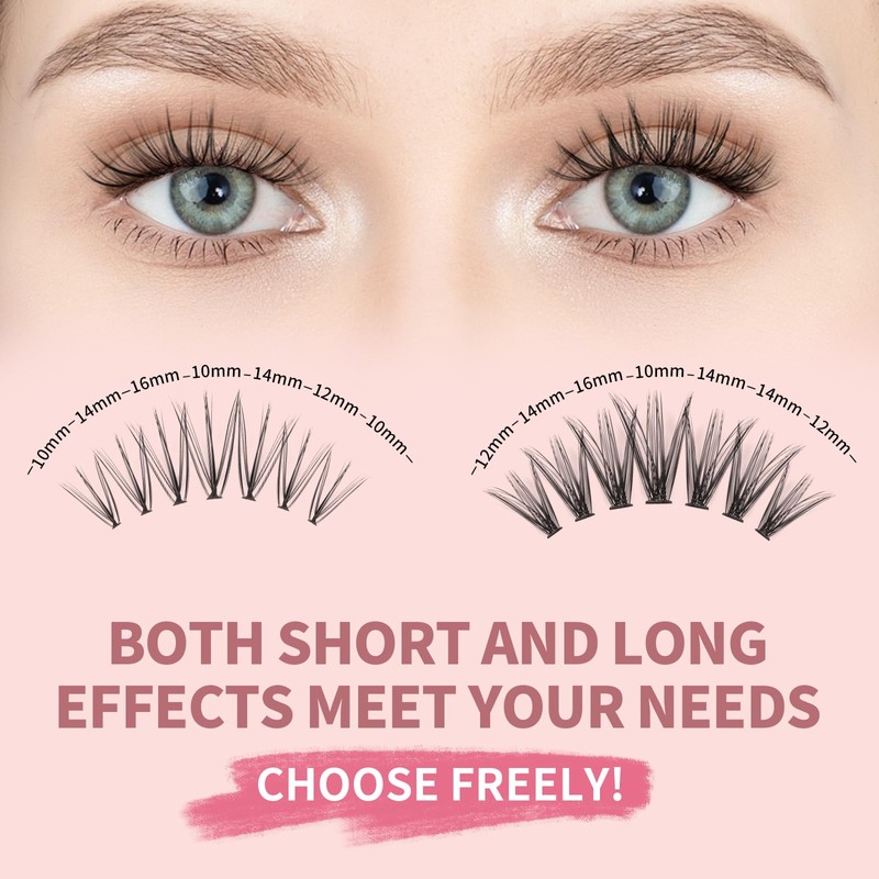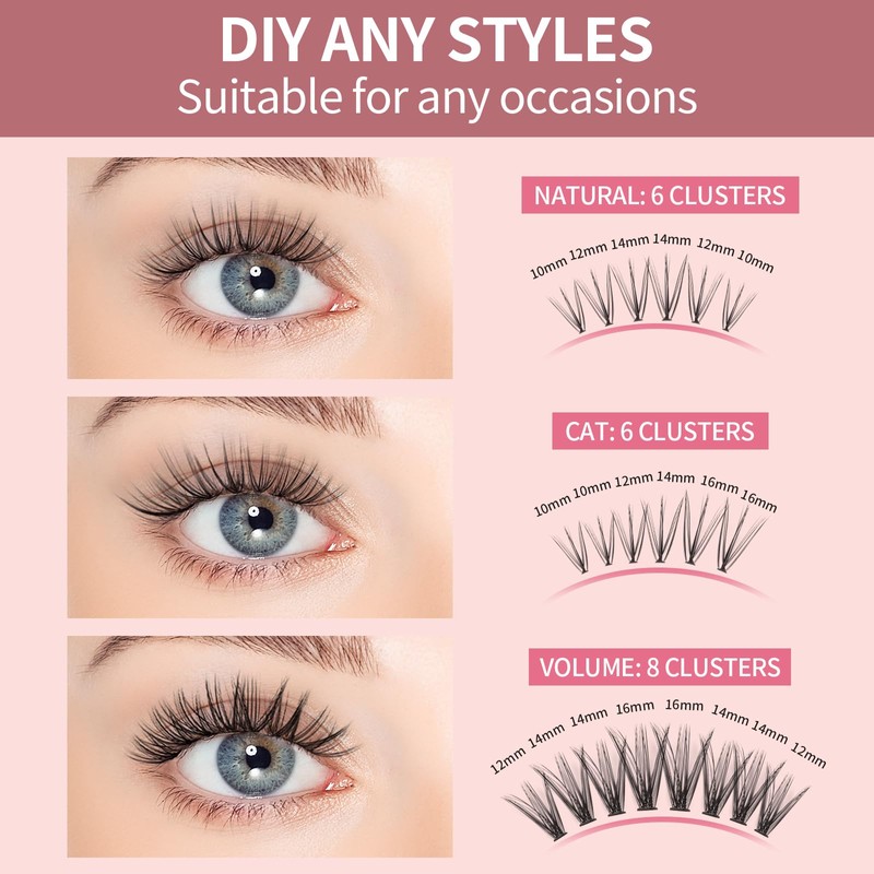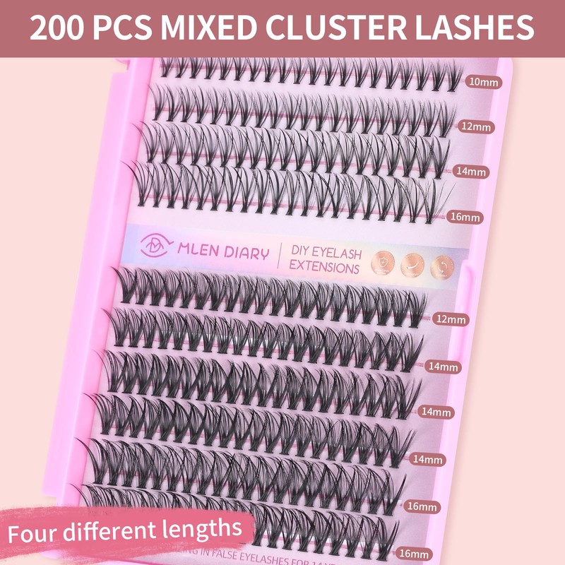 - Lash Clusters DIY at Home: 200 clusters in one tray, natural and volume 2 styles with 10-12-14-16mm various lengths. You can DIY cluster lashes at home instead of beauty salon, save money and time for makeup, provide more convenient. Just one box of eyelashes to create the perfect lash effect for every occasion.